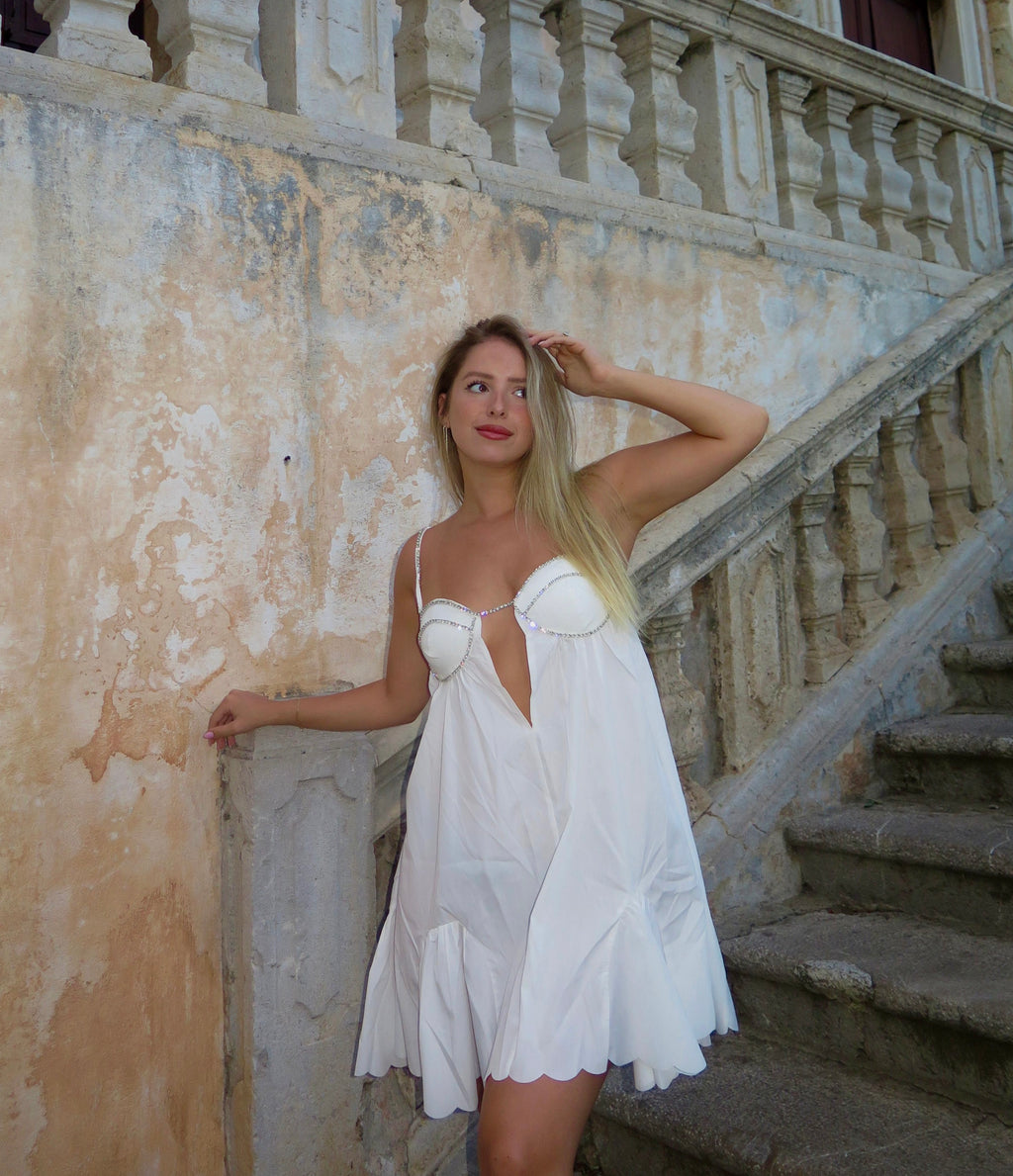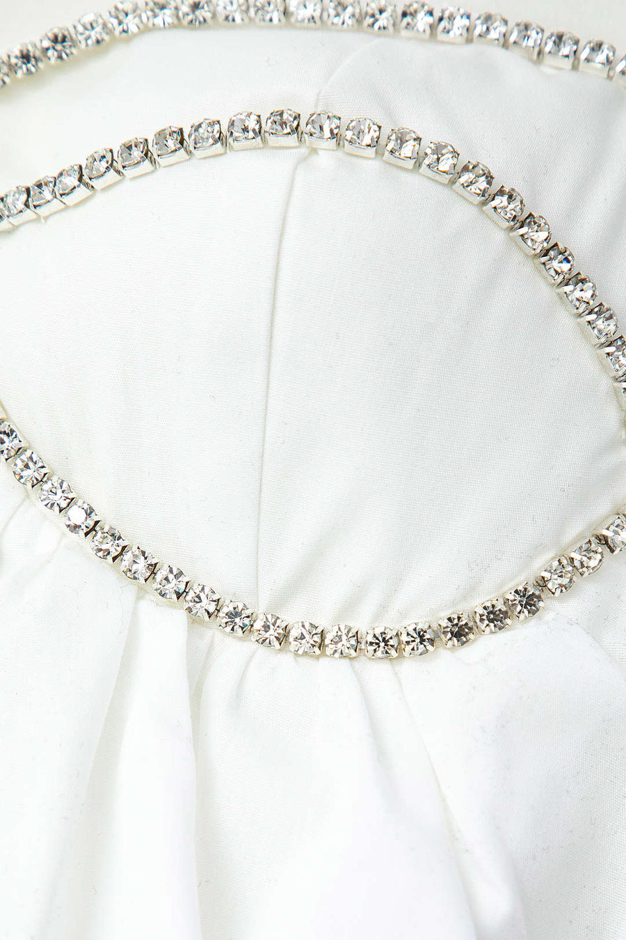 מה שנותן לשמלה את המראה היוקרתי והופך אותה לכל כך מושלמת ומדוייקת הם היהלומים המעוטרים סביב השמלה באיזור הכתפיים והחזה.